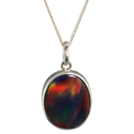 Full Details:  Australian Black Doublet Opal Bezel set pendant Colour - Red/Green/Blue/Gold Pattern - Broad Rolling Flash Shape - Oval Material - 925 Sterling Silver This beautiful one of a kind...