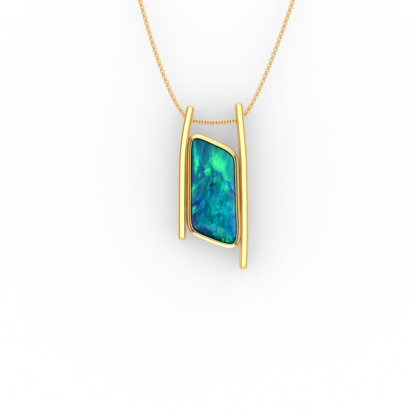 The natural beauty of aqua greens and peacock blues that can only be exhibited in this Australian Opal Doublet has been set in a semi tension setting that gives you a look of sophistication and individuality.   This gracefully designed pendant with it luxurious gold rails and rub over setting will look glamorous without trying!