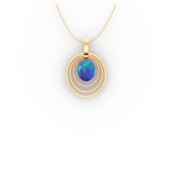 The delicate dreamy Blues and aqua Green colours that flash and dance across the face of the Opal Doublet are highlighted by multiple oval rings of opulent gold. The gold finish adds that luxurious look to the pendant and...