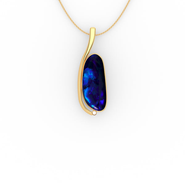 This ultra modern pendant is mesmerizing with its Midnight to Royal Blue colours, that are displayed in Australian Opal.   Its clean sleek curve encapsulates the long slender shape of the Opal Doublet, seamlessly the luxurious gold extends upwards to...