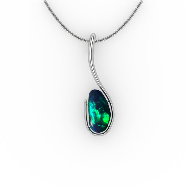 This ultra modern pendant design accentuates the Solid Black Opal with its striking Lush Green and Royal Blue colours.    With its clean sleek curve, it encapulates the bezel and  extends seamlessly upwards to form a minimalist styled bale.