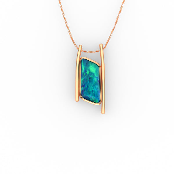 The natural beauty of aqua greens and peacock blues that can only be exhibited in this Australian Opal Doublet has been set in a semi tension setting that gives you a look of sophistication and individuality.   This gracefully designed pendant with it luxurious gold rails and rub over setting will look glamorous without trying!
