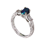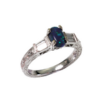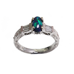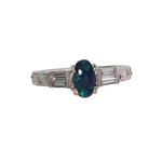 Full Details:  Australian Solid Black Opal Claw set opal ring with 4 Baguette Diamonds Colour - Green/Blue Shape - Oval Material - 18 kt White Gold Size - Aus N...
