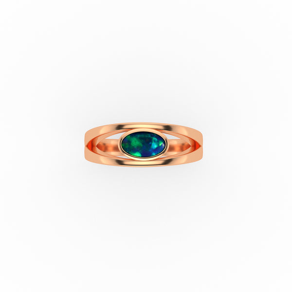 This Opal Doublet with the alluring natural beauty of Australian Opal, colours of aquamarine green and blue colours is bezel set in gold and mounted in the curves of the split ring.