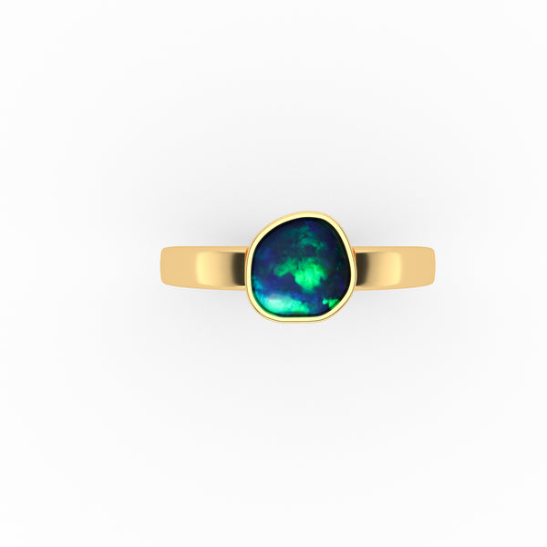 This Opal Doublet with it's natural beauty and colours of cobalt blues and aqua greens is encased in gold.  A simplicit designed ring that conveys style, innocence and your sense of sophistication.