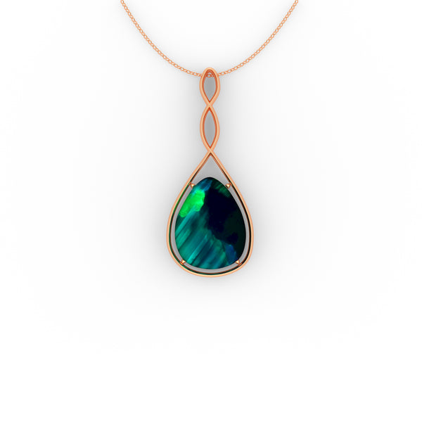 A delightfully designed pendant with its Tear Drop shaped Australian Opal Doublet of Royal Blue and Emerald Greens colours has an authentic charming appeal.  The smooth sweeping curves of gold that...