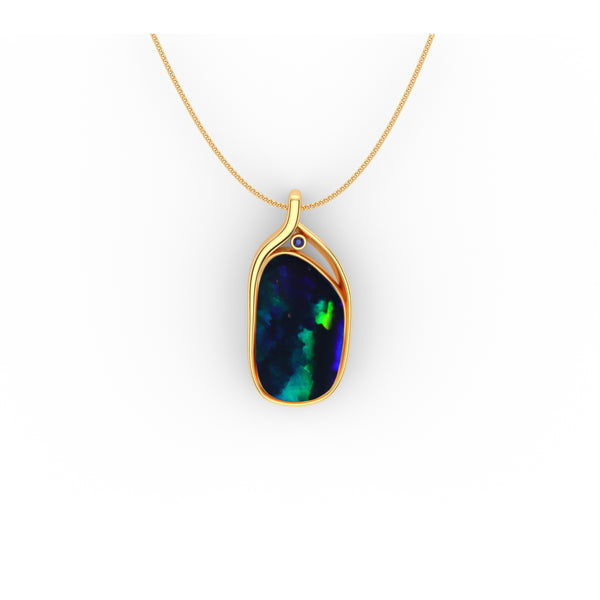 The Opal Doublet with it's striking Emerald Green and Royal Blue is encased in gold and accented by a sparkling faceted blue gemstone.  Gracefully the bezel extends upwards to form a minimalist styled bale. ...