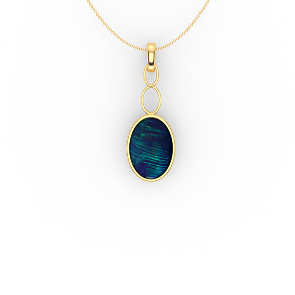 A delightfully designed pendant with its Oval shaped Australian Opal Doublet of  Brilliant Blue and Rich Green colours has an authentic charming appeal.  From the enduring smooth bale, two connected gold ovals create a elegant elongated pendant for that stylish...