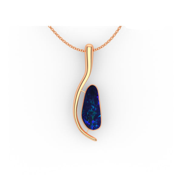 This ultra modern pendant is mesmerizing with its Rich Royal Blue and sparkling flashes of Green that you can only get in Australian Opal.   The sleek curve and clean lines extend seamlessly upwards...