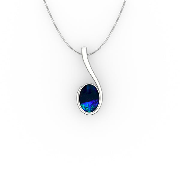 This ultra modern pendant design accentuates the richness of the Royal Blue colour of the Opal doublet.    With its clean sleek curve, it encapulates the bezel and seamlessly extends upwards to form a minimalist styled...