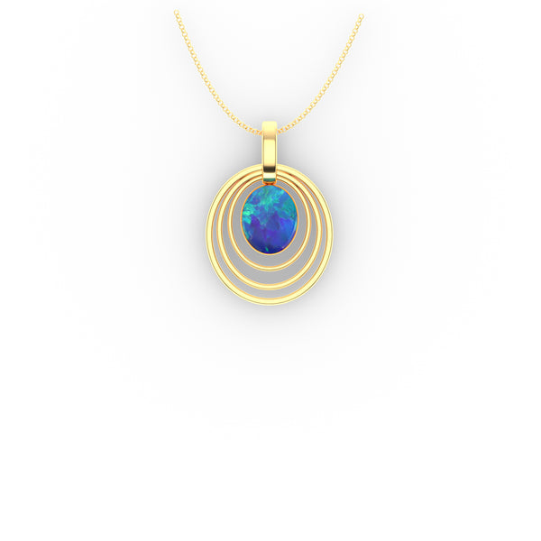 The delicate dreamy Blues and aqua Green colours that flash and dance across the face of the Opal Doublet are highlighted by multiple oval rings of opulent gold.